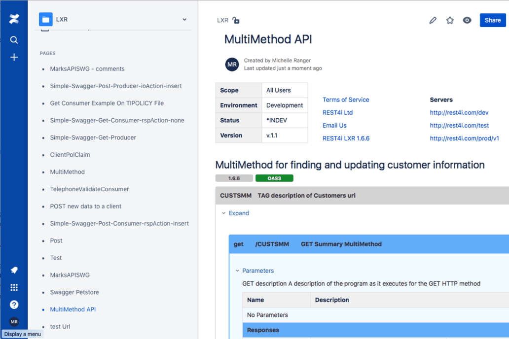 - Genera una clara documentación en páginas de Atlassian Confluence a partir de las especificaciones Open API.